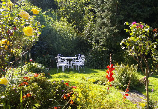The box hedging has been propagated from an initial 100 plants. Fruit trees have been gifts from friends and family. Around their trunks the Olympic Circle flower beds were created in 2006 to hide spent bulb foliage.